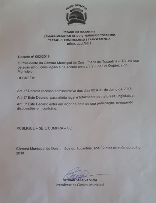 Poder Legislativo de Dois Irmãos – Estado do Tocantins