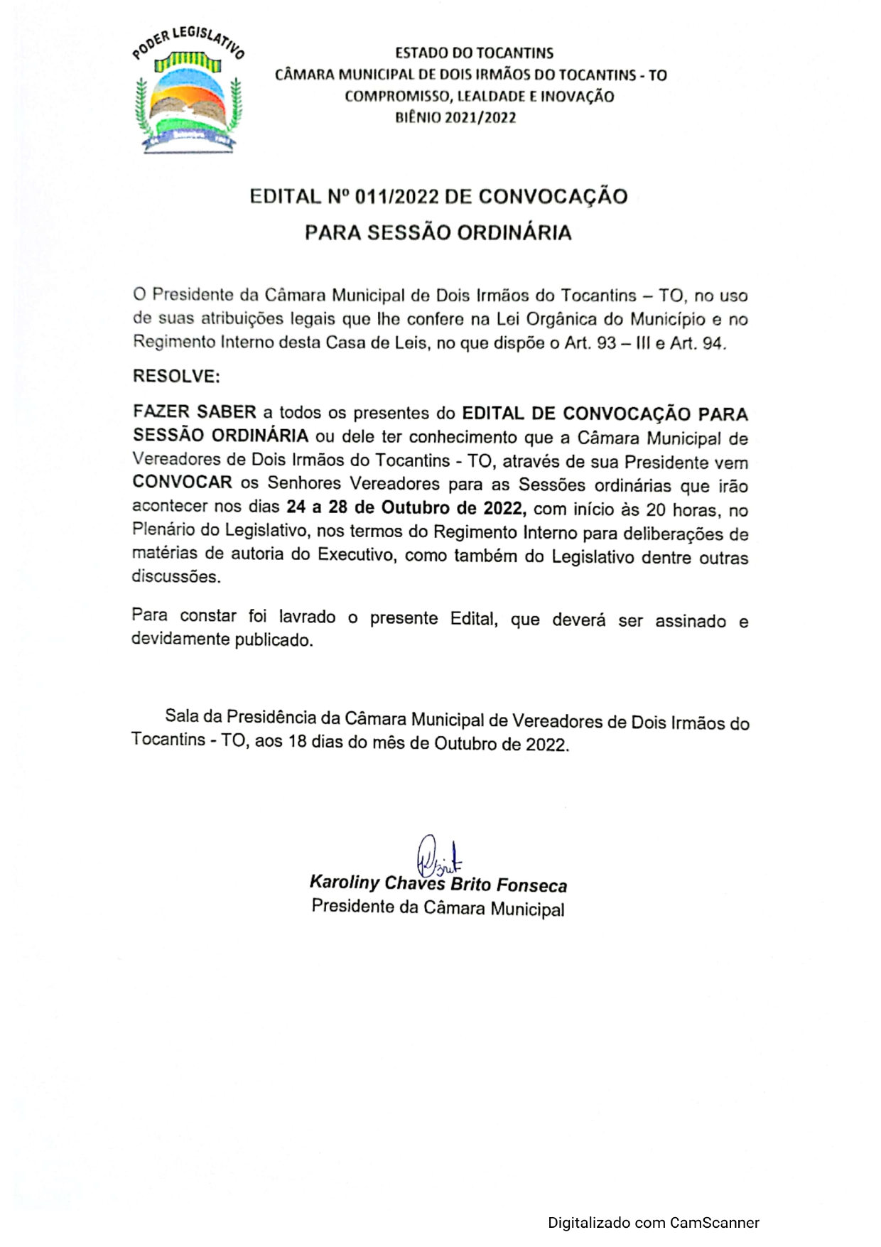 Poder Legislativo de Dois Irmãos – Estado do Tocantins