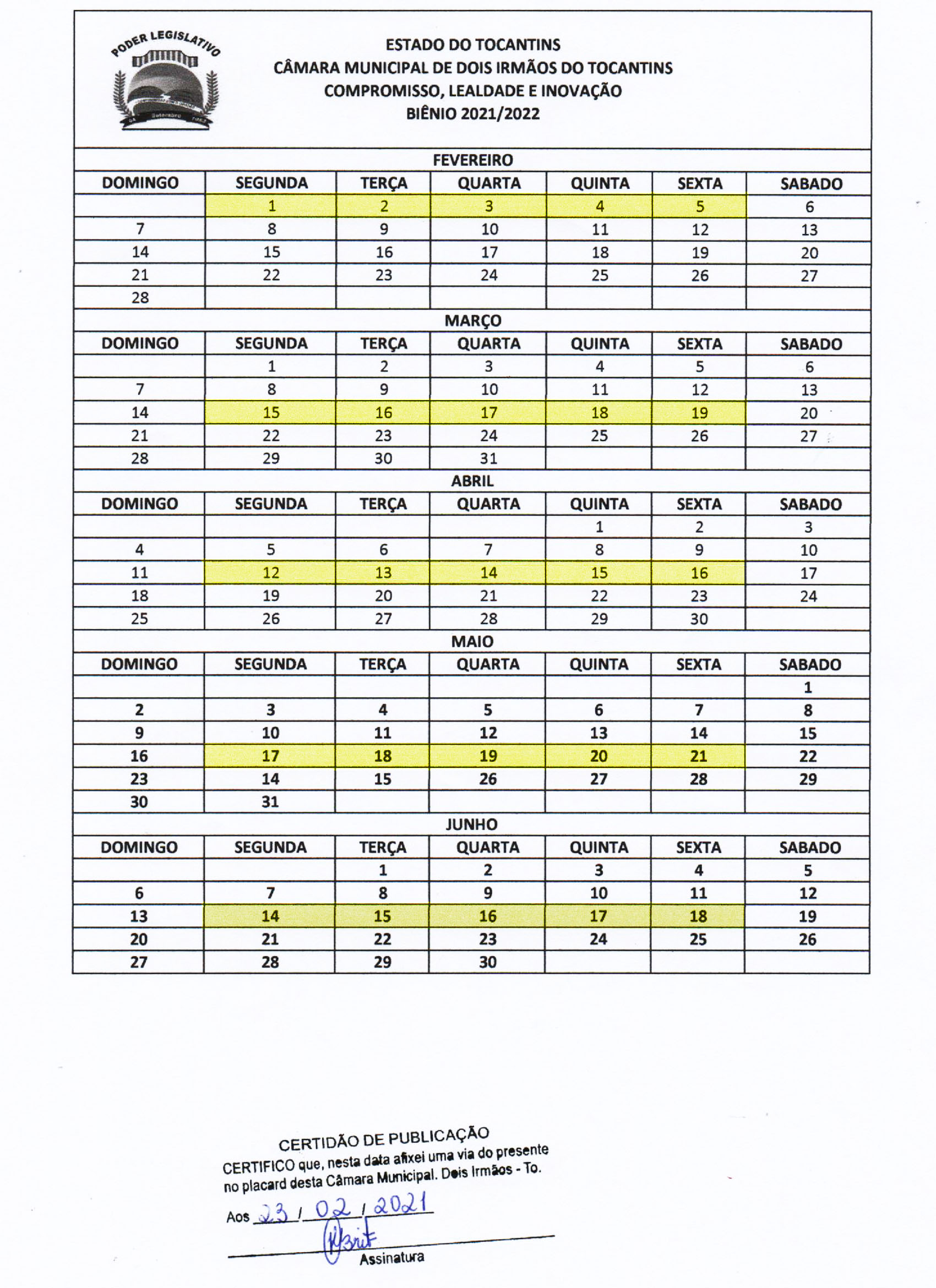 Datas das Sessões Legislativas de fevereiro a junho de 2021.